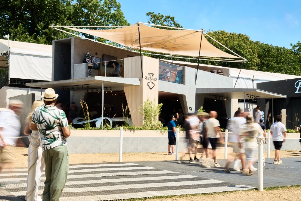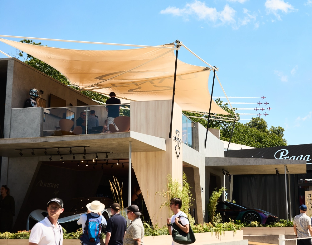 We delivered a striking two-storey stand that showcased Zenvo’s cars and brand in a dramatic, high-end environment. Features included a tensile roof with a rear-illuminated logo for maximum visibility, planter zones with water features for a refined finish, and a mix of social spaces, including a bar counter, lounge seating, and standing tables on the upper floor. Timber finishes, concrete-effect cladding, and glass balustrades created a sleek, architectural look, while picture frames with spotlights and branded details elevated the storytelling of the stand. Crucially, the entire structure was designed with modular engineering, allowing it to be flat-packed, shipped to the US, and rebuilt in a revised format for the next show. The result was a luxury, flexible stand that turned heads in Europe and America alike, delivering maximum brand impact across continents.